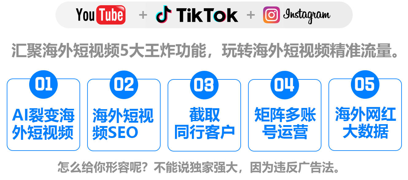 多平台官方通道矩阵发布到:Instagram、TIKtok、Youtube等平台(持续更新中) ,通过多账号+多视频+#多话题+#热门标签+多标题+#@用户的矩阵AI技术,更快优化,更稳定的实现短视频SEO排名和曝光。