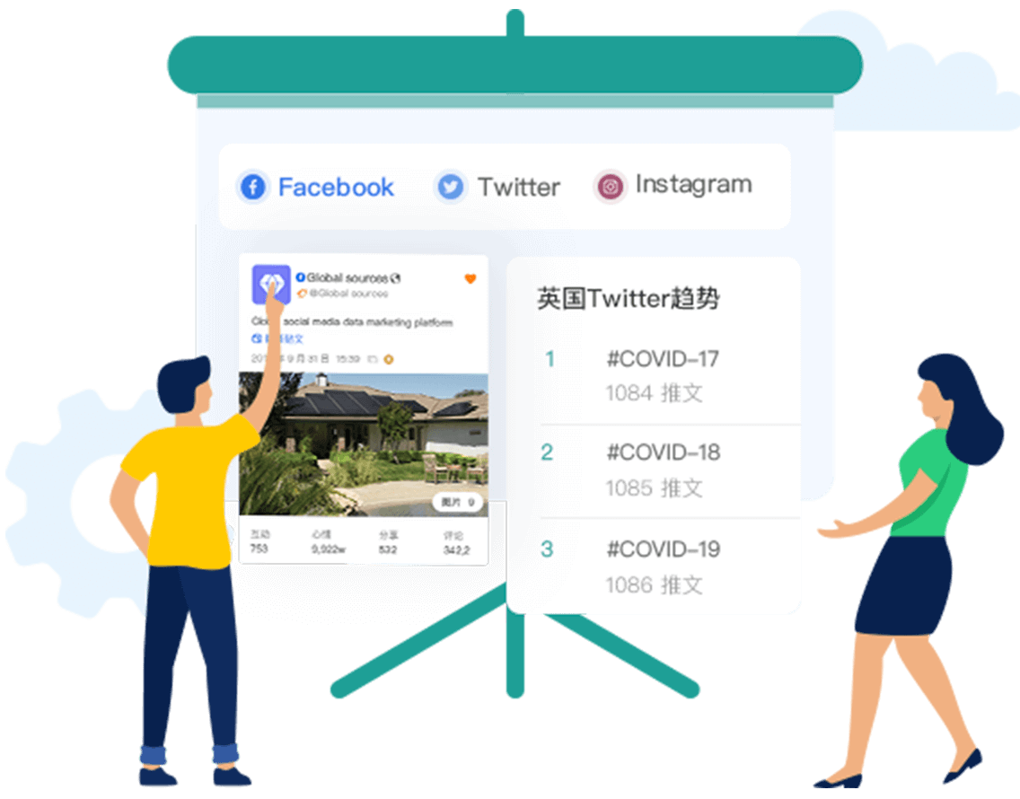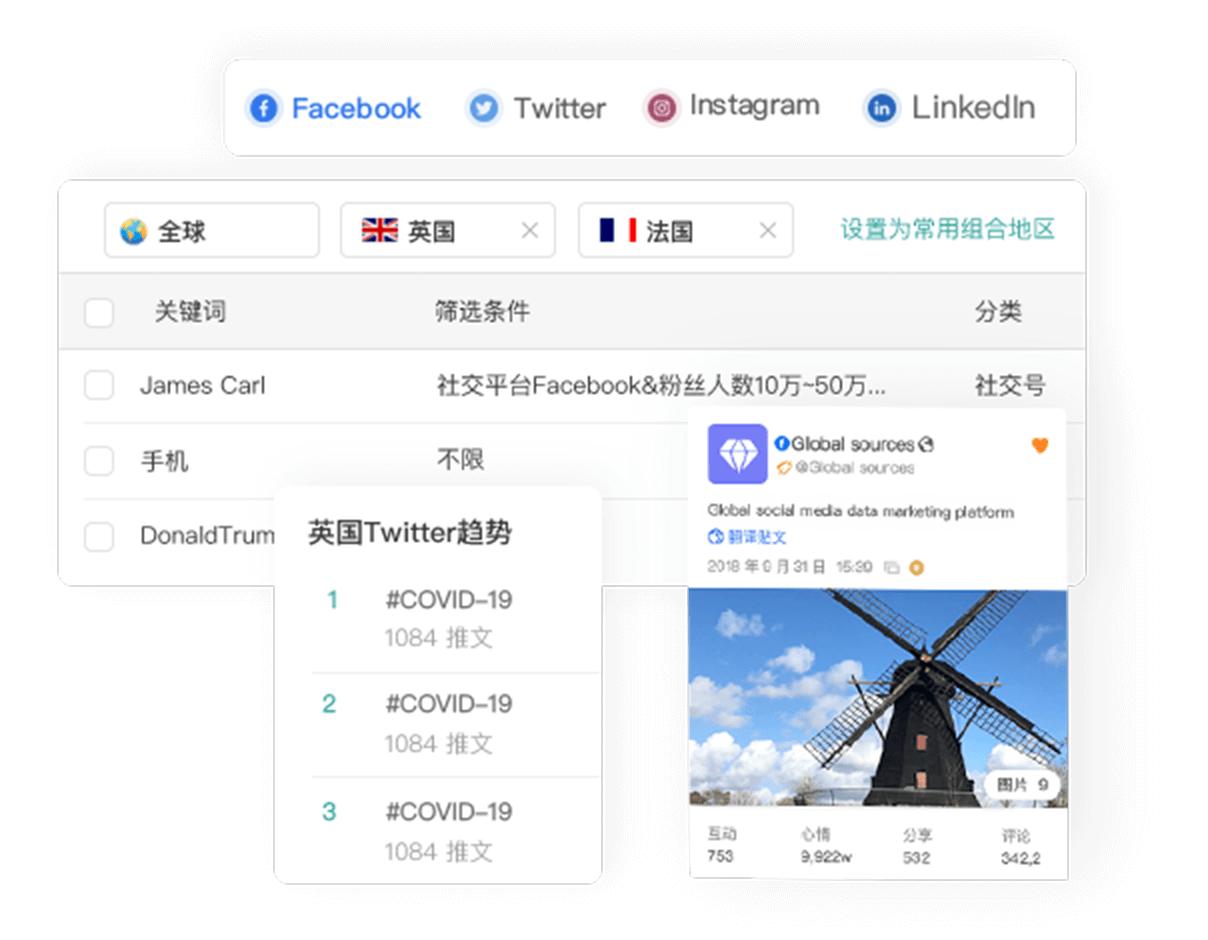 支持Facebook、Twitter、Instagram、LinkedIn、YouTube 等海外社交主流媒体平台数据实时监控分析