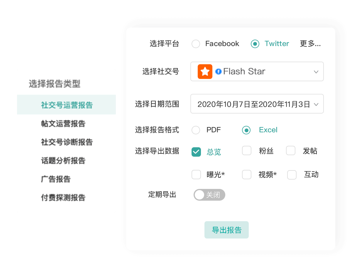 支持社交号运营报告、贴文运营报告、社交号诊断报告、粉丝画像报告绩效报告等12种类型报告导出